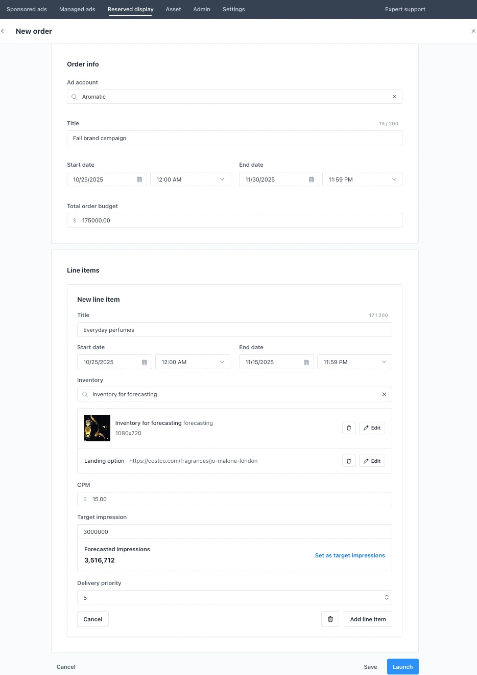 - Select advertiser (ad account), name the order, set the overall schedule, and include a total budget label (for your billing alignment). The order is the umbrella container for its line items.