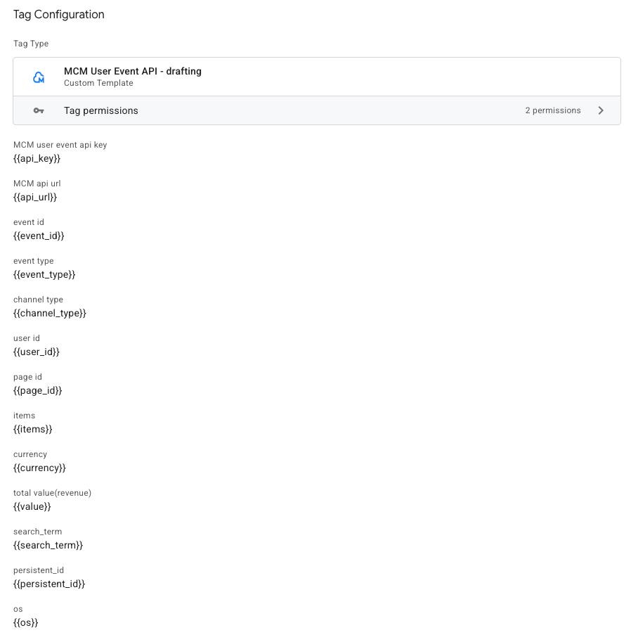 The official MCM User Event API Server-side templates is available in the Community Template Gallery contains a script to send API request to MCM Event API with required body contents per event_type. When you import the provided tpl file, the following configuration will be added on your template.